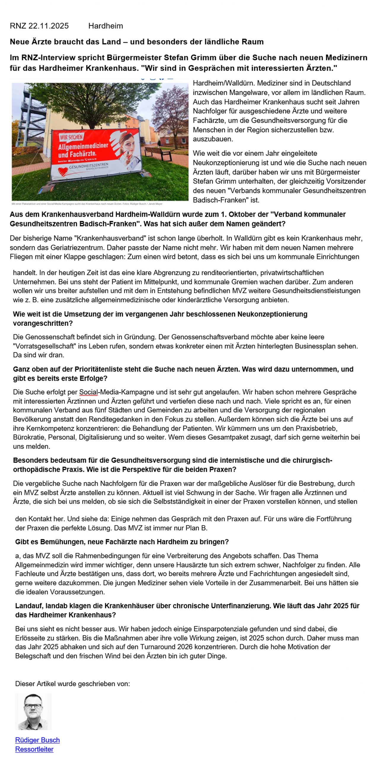 Im RNZ-Interview spricht Bürgermeister Stefan Grimm über die Suche nach neuen Medizinern für das Hardheimer Krankenhaus. „Wir sind in Gesprächen mit interessierten Ärzten.“