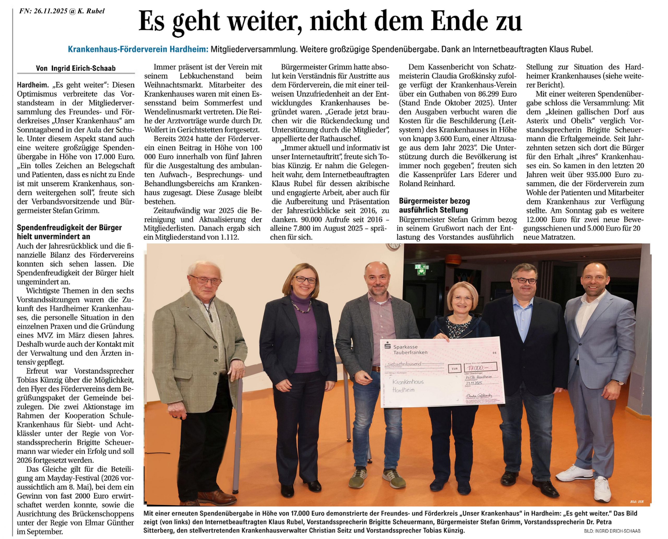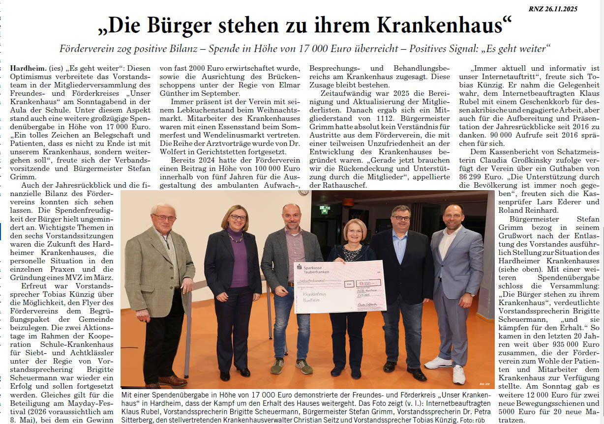 Hardheim. Die jährliche Mitgliederversammlung des Freundes- und Förderkreises Krankenhaus Hardheim findet am Sonntag, 19. November, um 18 Uhr in der Aula des Walter-Hohmann-Schulzentrums statt. Auf der Tagesordnung steht neben den obligatorischen Tätigkeitsberichten und Grußworten auch wieder eine großzügige Spendenübergabe an das Hardheimer Krankenhaus.